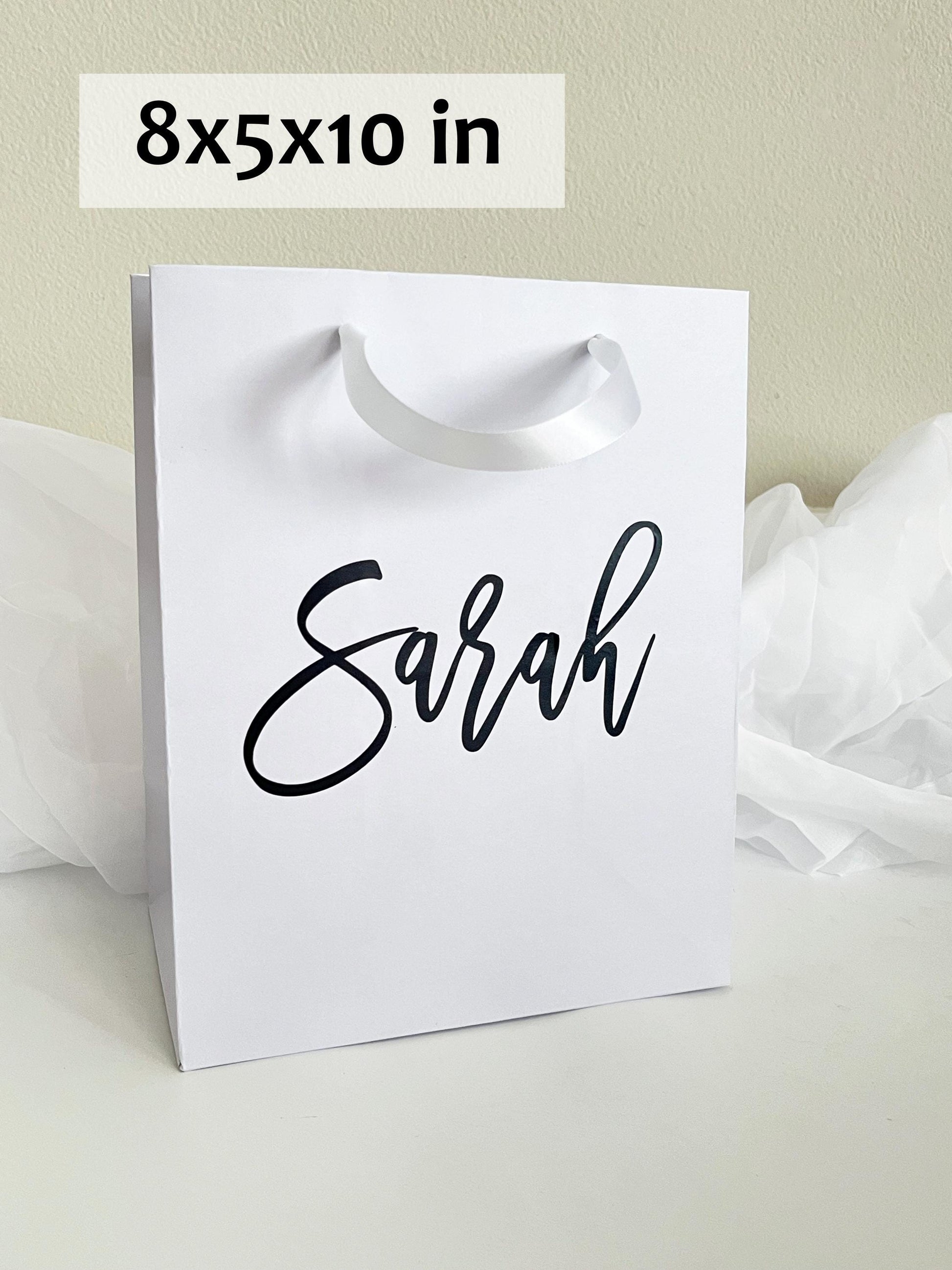 Choose from black or white matte finishes in one ideal size (8x5x10 inches) that works beautifully as bridesmaid gift bag. Each bag can be personalized with a name, message, making it a standout choice for business gift bags, bulk gift bags, or custom gift bag sets.
